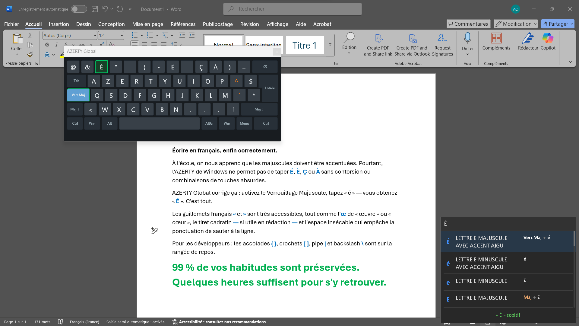 « AZERTY Global est une disposition clavier française qui corrige les défauts historiques de l'AZERTY français de Windows tout en préservant les habitudes des utilisateurs. Elle permet de taper É, œ, « » et des centaines de caractères internationaux en toute simplicité. »
